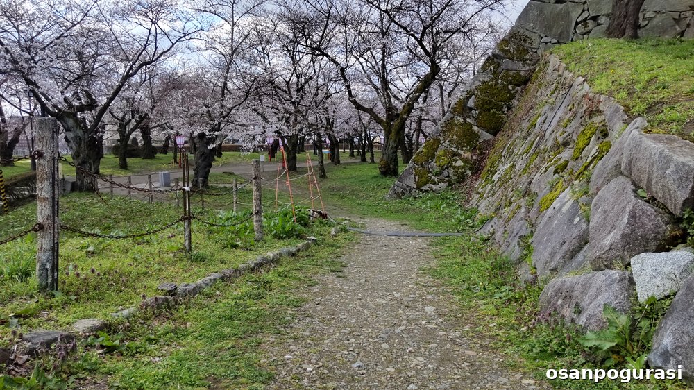 桜の絨毯や桜のトンネル、石垣と桜のコントラストを楽しみながら、歩くことができます。