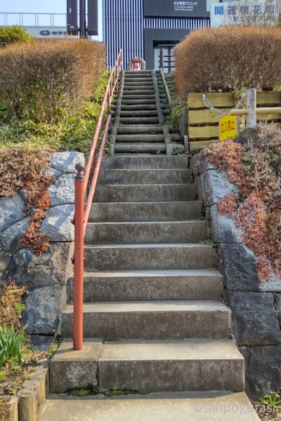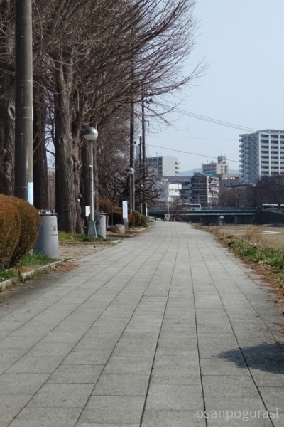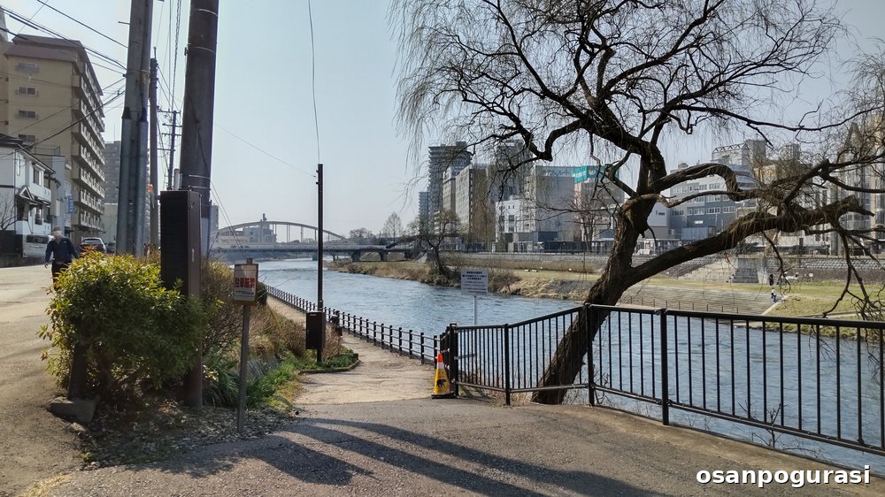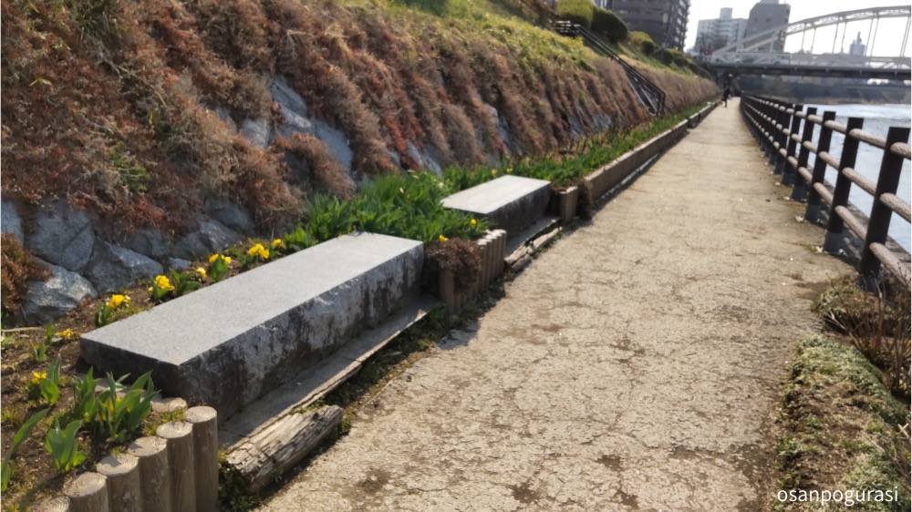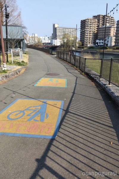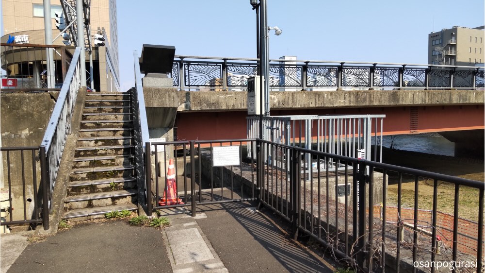 - 歩道:舗装・ほぼ平坦・川沿いに降りる階段